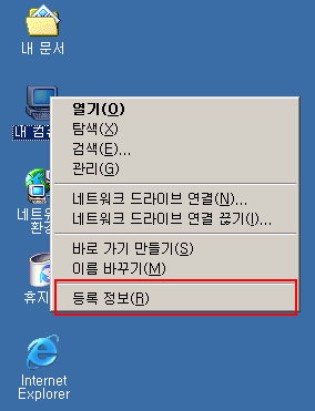 (1) 바탕화면의 내 컴퓨터 아이콘 위에서 마우스 오른쪽 버튼 클릭 → 등록정보(속성)을 선택합니다. |