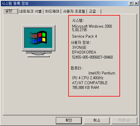(2) 시스템 등록 정보 확인 (아래 그림 예 : CPU:Pentium4 2.4G, RAM:768MB) |
