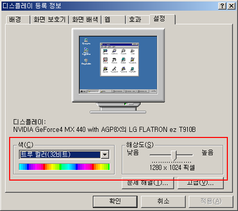 (3) 화면 해상도 확인 및 변경은 바탕화면에서 마우스 오른쪽 버튼 클릭 → 등록정보(속성) → 설정을 선택합니다. |