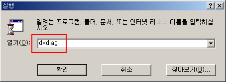 (2) 실행창에 dxdiag를 입력한 후 확인 버튼을 클릭합니다. |
