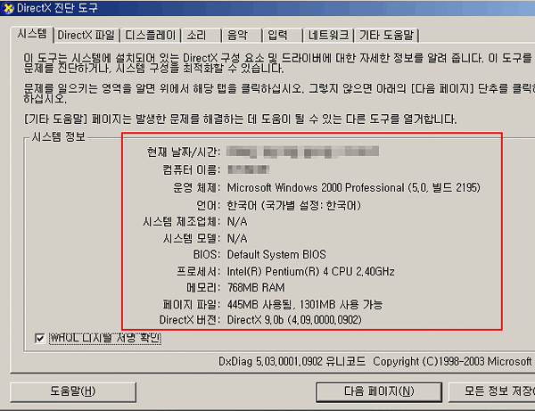 DirectX 진단도구 시스템 등록정보나 디스플레이 등록정보로 정확한 정보를 파악하기 어렵거나,