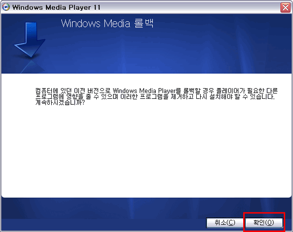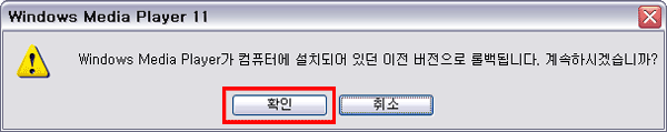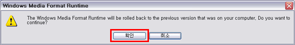 (4) Windows Media 롤백 확인 창이 나오면 확인을 클릭하여 계속 진행 |