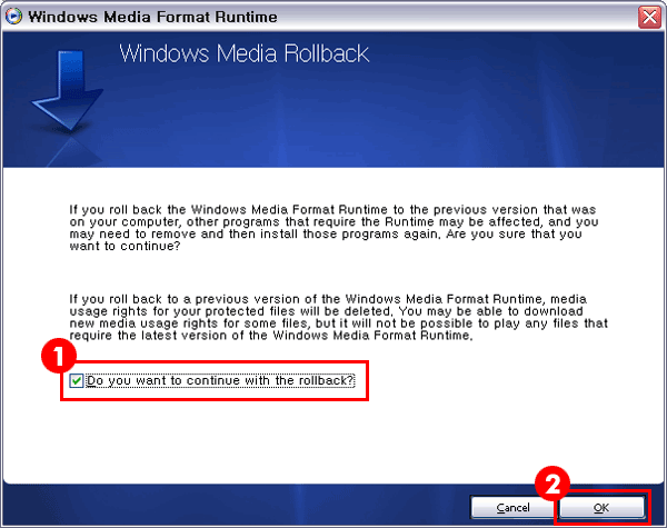 (8) Windows Media Format runtime롤백을 계속 진행하겠다는 메시지 체크 후
