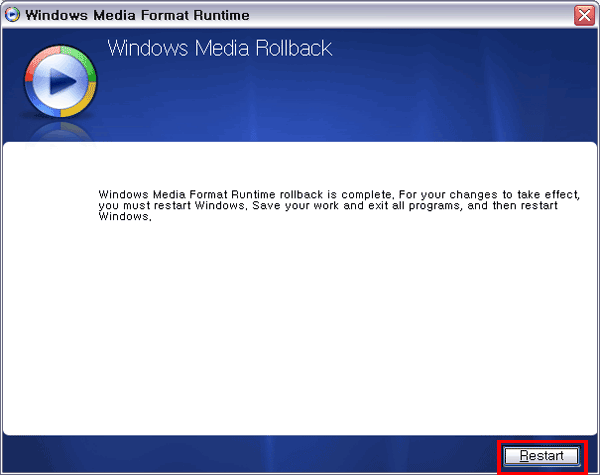 - Windows Media Player 11 다운그레이드 작업을 위한 모든 과정이 완료 되었습니다. Restart를 클릭하여 컴퓨터를 재시작한 후