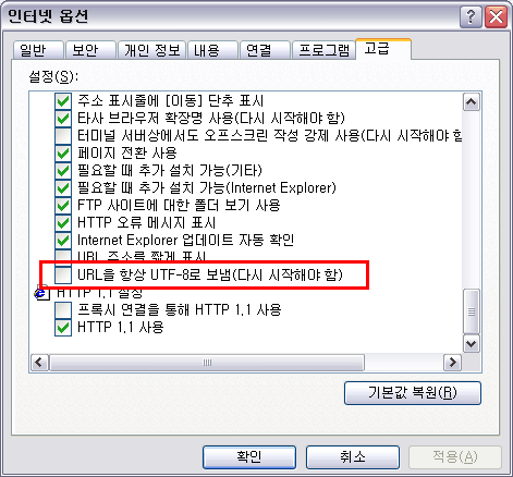 설정 중 URL을 항상 UTF-8로 보냄 기능은 유니코드(전 세계의 문자들을 표시하기 위한 표준 코드)로 인코딩