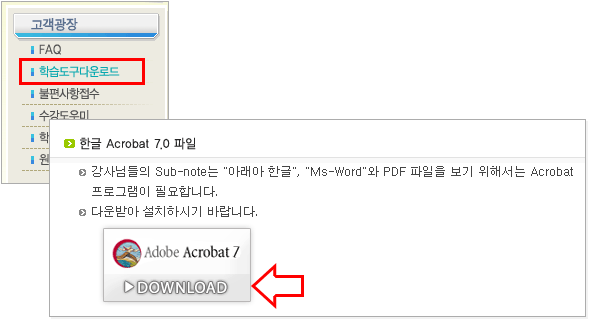 이패스코리아 > 고객센터 > 학습도구다운로드를 통하여 Adobe Acrobat 7 을 다운받아