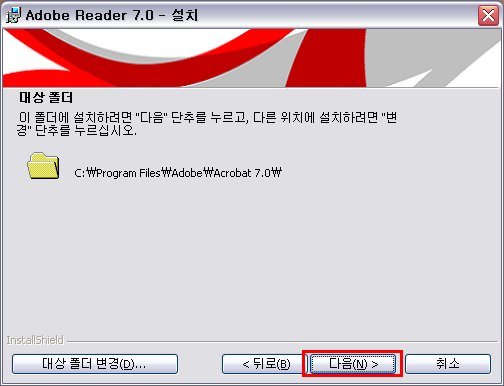 설치 대상 폴더를 변경하고자 할 경우 대상 폴더 변경(D)를 클릭한 후 대상