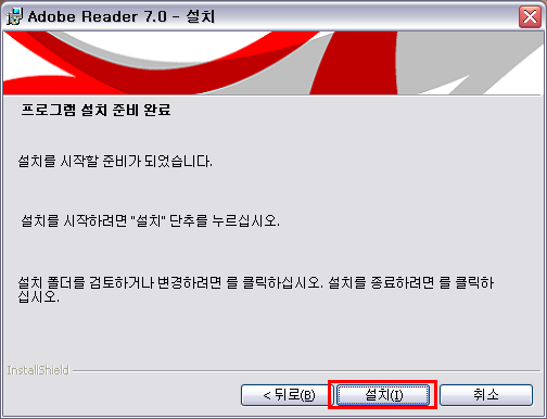 Adobe Acrobat 7 설치 준비가 완료 되었습니다. 설치(I)를 클릭하여 설치를 진행합니다.