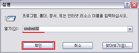시작 > 실행을 클릭하여 sndvol32(볼륨 컨트롤러 활성화) 명령어를