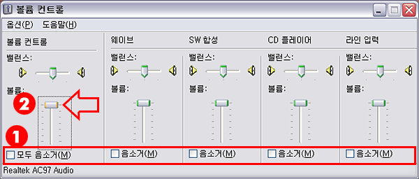 활성화 되면 음소거 란에 체크가 되어 있지 않은지 확인하고 체크가 되어 있다면 체크를 제거합니다. 그 다음