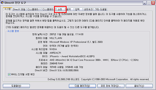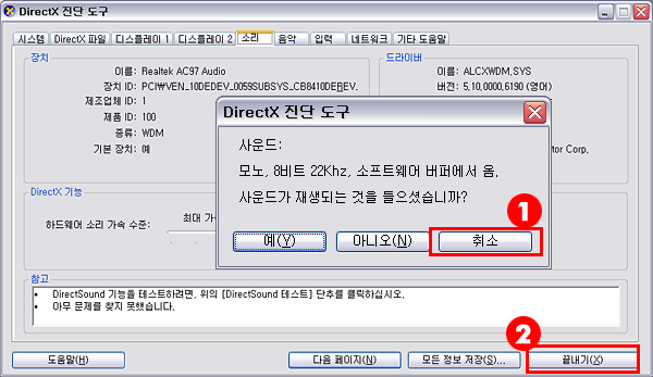 있진 않은지 볼륨이 낮게 설정되어 있진 않은지 체크 한 후 Direct X 진단 도구의 소리 옵션을 통