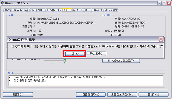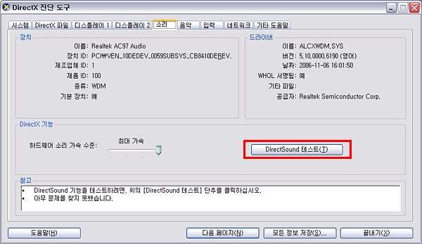 한 후 음성이 나오는지 여부를 확인하기 위해 Direct X 진단 도구를 실행합니다.